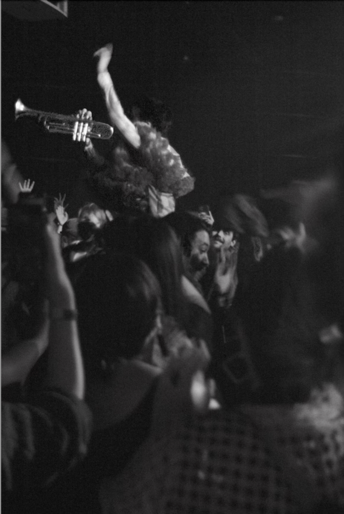 The main performance was incredible, just as expected. Every member of the band changed costumes multiple times, and every song had its own choreography. The dances were all cartoonishly simple: they ranged from jumping around from left to right to spinning in a circle while doing funny little squats. In any other show I might have been underwhelmed, but each move contributed to the odd, dreamlike setting of the concert. Kalmia and Alex both rocked out multiple ear-warming, toe curling solos on baritone saxophone and trumpet respectively. Hearing Kalmia rip on the baritone during “If U C My Enemies” is an experience I will not soon forget: a certifiably stinky riff honked out by a princess underneath blood red lights with thick fog rolling around her feet. At one point Kalmia even brought out a flute and let out a solo that could only have been composed by a small species of fairy-like creatures that use domesticated hummingbirds as their primary form of transportation.