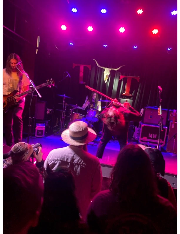 I stood shoulder to shoulder with KUPS compatriot Sage Matkin as the crowd began to stir. Our in-house photographer, V Solar-Miller, was to our right, perched in an ideal sniper’s nest at the edge of the stage. A liveliness took hold of the faces around us as the performers prepared. I watched as punks well older than myself–perhaps late-twenties well into mid-forties–shed the weight of their years. Sage and I speculated about the unfamiliar trio that warmed the stage–our tickets hadn’t listed an opener–as the oldheads in the crowd were transported to their bygone rocker days. Time seemed to tick backward as the magic of Frankie and the Witch Fingers wafted through the Tractor Tavern well before they hit the stage.