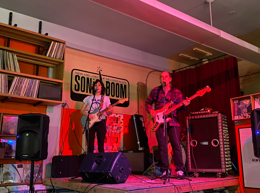 When you walk into Sonic Boom Records with your best friend (Hi KT) and see a plywood stage set on top of vinyl stands, you gawk. A drum kit, one large speaker on wheels, two small speakers, one guitar case, and one bass case seems the max weight that stage would hold. But, boy oh boy, when you see Rachel Ratner walking amongst the crowd, you think: that stage better fucking hold. And so, when Mrs. Wimps, her husband (Mr. Wimps), and the drummer (Mr.-but not in the way that insinuates marriage to Mrs. Wimps, but good friend I’m sure-Wimps) are standing and readying themselves to perform, you lean against the vinyl shelves and prepare yourself. Rachel says hello (you scream), and opens with a promotion of the sale of earplugs found behind us at the counter (you don’t buy them obviously; the deafness for the next day or two is a reminder you’re alive).