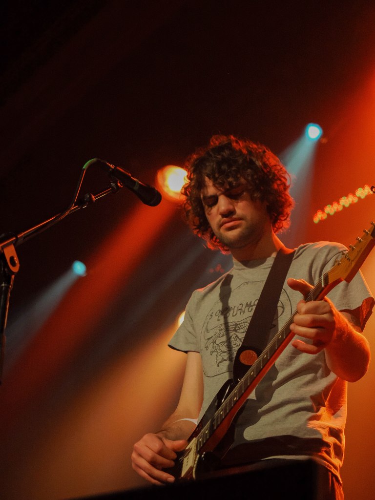 Wild Pink, an indie rock band from New York, opens the show and plays us into the raw, alternative folk music that will sound for the rest of the night. They have a Duster vibe, with their casual clothes and minimal talking between songs. Their set is tight, and I capture photos of their grown-out hair as it falls across their faces. Ross sings with his eyes closed, in a different world, unique meaning in his words, life peeking through with every song. They seem like a band my dad would tell me to listen to, so I’m into it. They wrap up, and the packed theatre, full of mid-20s, overalls-wearing, Reiner-loving folks, chat with one another and fill the room with their own sort of music as we all anticipate Mj Lenderman and his crew.